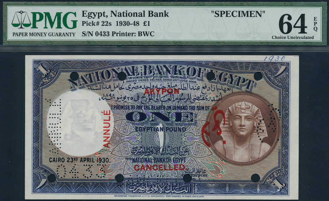 (x) National Bank of Egypt, specimen £1, 23 April 1930, no serial number, blue and brown on multicolour underprint, Tutankhamen at right, value at centre and each corner, reverse green, the Mosque of al-Mansour Seif el-Dein Qa'la un at centre, 8 cancellation holes, perforated and overprinted CANCELLED in 4 languages