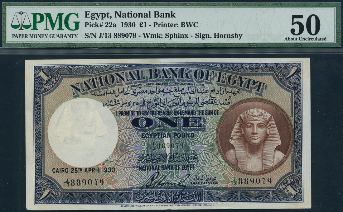 (x) National Bank of Egypt, £1, 25 April 1930, serial number J/13 889079, blue on multicolour underprint, King Tutankhamen at right, value at centre and each corner, Hornsby signature, reverse green, the Mosque of al-Mansour Seif el-Dein Qa'la un at centre
