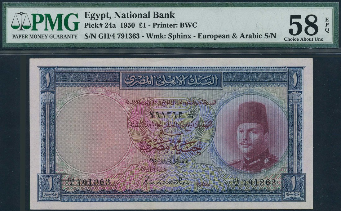 (x) National Bank of Egypt, £1, 1950, serial number GH/4 791363, blue and violet on multicolour underprint, King Farouk at right, value at each corner, Leith-Ross signature, reverse blue, lake and temple ruins at centre