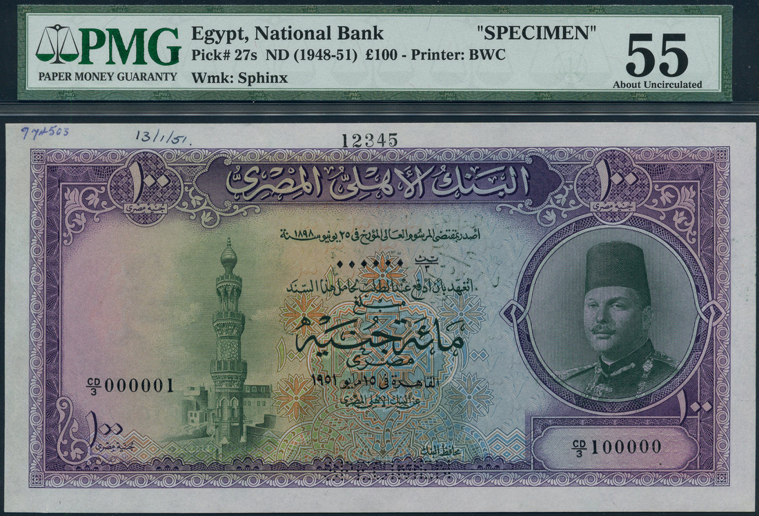 (x) National Bank of Egypt, printers archival specimen £100, 1951, serial number range CD/3 000001 - CD/3 100000, purple and green on multicolour underprint, King Farouk at right, Minaret at left, value at each corner, A.Zaky Saad signature, reverse purple, Mosque at centre, perforated SPECIMEN
