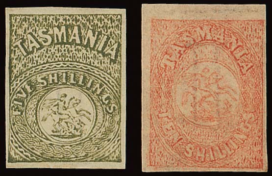 1863-80 watermark double-lined "1", imperf 5/- sage-green with good to large margins and 10/- salmon with good to very large margins and showing watermark inverted, both unused, regummed; the 10/- a little toned otherwise fine. Both with B.P.A. Certificate (2014). S.G. F5, F7, £2100. Photo