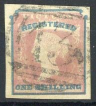 1854-55 Woodblock "registered" 1/- rose-pink and blue, good margins, cancelled "13", fine. S.G. 34, £200