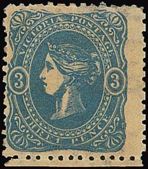 1860-66 Beaded Oval, Saunders paper watermarked with value in words, 3d. blue unused with large part original gum, centred to left, fine. S.G. 90b, £275. Photo