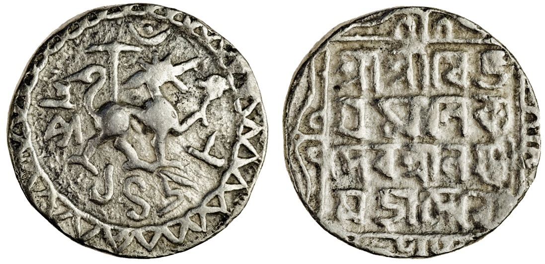 Tripura, Vijaya Manikya (1532-64), Tanka, 10.68g, Sk.1458, citing Queen Laksmi, lion to right, standard above, crescent and bead above head, date below, lion appears to be holding a symbol, within circular toothed border, rev. Śrī Śrī Vija/ya Mānikya/ Deva Śrī Laksmī/Mahā Devyau within square with ornamental border (RB. 94; KM. 63), very fine, rare