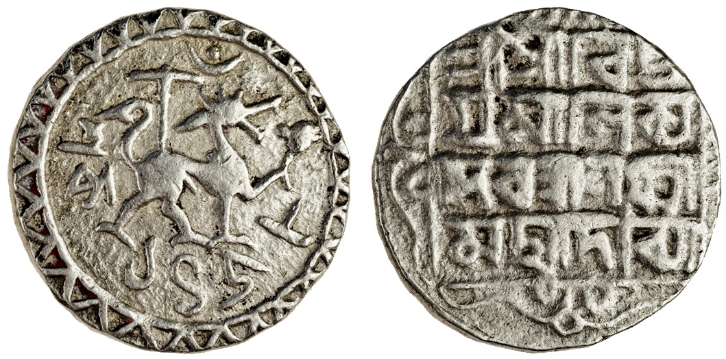 Tripura, Vijaya Manikya (1532-64), Tanka, 10.68g, Sk.1458, citing Queen Laksmi, lion to right, standard above, crescent and bead above head, date below, lion appears to be holding a symbol, within circular toothed border, rev. Śrī Śrī Vija/ya Mānikya/ Deva Śrī Laksmī/Mahā Devyau within square with ornamental border (RB. 94; KM. 63), very fine / about very fine