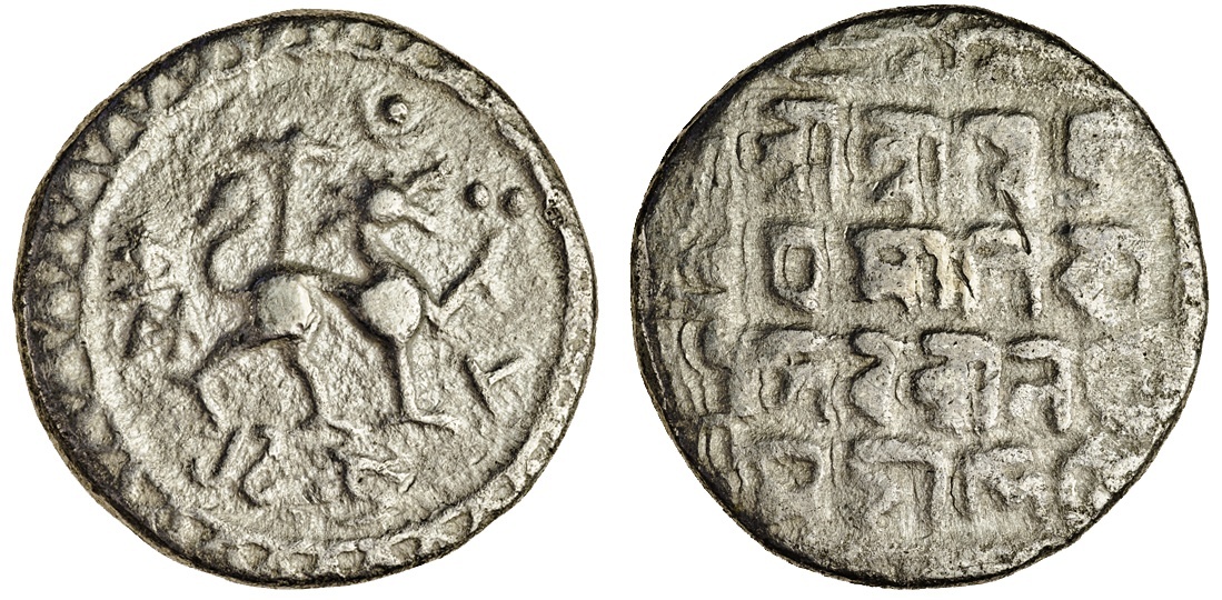 Tripura, Vijaya Manikya (1532-64), Tanka, 9.76g, Sk.1458, citing Queen Laksmi, lion to right, standard above, crescent and bead above head, two beads by mouth, date below, within circular toothed border, rev. Śrī Śrī Vija/ya Mānikya/ Deva Śrī Laksmī/Mahā Devyau within square with ornamental border (RB. 97; KM. 63), about very fine / fine