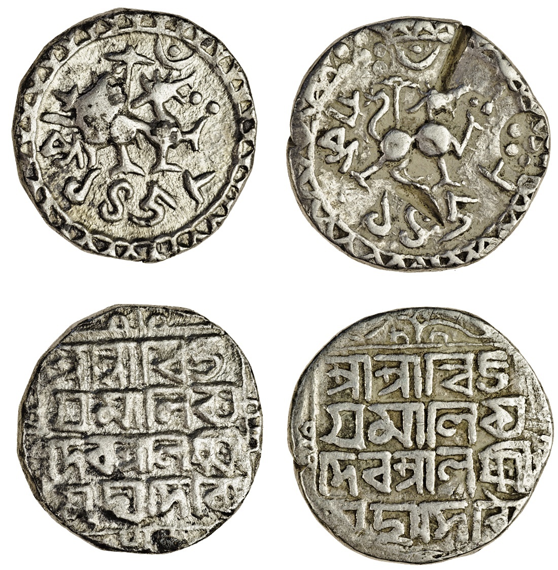 Tripura, Vijaya Manikya (1532-64), Tankas (2), 10.56g, 10.31g, Sk.1458, citing Queen Laksmi, lion to right, standard above, crescent and bead above head, two beads by mouth, date below, within circular toothed border, rev. Śrī Śrī Vija/ya Mānikya/ Deva Śrī Laksmī/Mahā Devyau within square with ornamental border (RB. 97; KM. 63), the first with obverse die fault, the second with two test cuts and shroff mark, very fine (2)