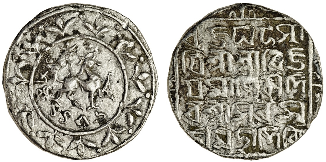 Tripura, Vijaya Manikya (1532-64), Tanka, 10.55g, Sk.1476, citing Queen Sarasvati and commemorating a ritual bath at Dhvaja Ghat, lion to right, standard above, date below, within a wide floral border, rev. Dhvaja Ghata Snā/yi Śrī Śrī Vija/ya Mānikya De/va Śrī Sarasva/ti Mahā Devyau within square with ornamental border (RB. 107; KM. 65 var.), very fine, very rare