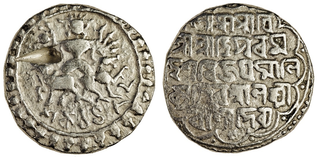 Tripura, Vijaya Manikya (1532-64),  Tanka, 10.68g, Sk.1482, citing Queen Lakshmi and commemorating a ritual bath in the River Lakhi, as previous lot but with large pellet by the upper hand of Shiva, rev. a crescent in top arc above the legend, star below (RB. 119; KM. 67), with obverse test cut, about very fine, scarce