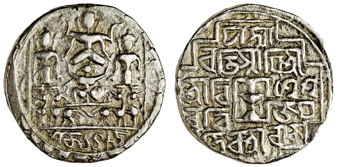 Tripura, Vijaya Manikya (1532-64), Tanka, 10.42g, Sk.1485, citing Queen Vaka and commemorating a ritual bath in the River Padma, Vishnu seated, supported by Garuda, with two attendants, all supported by four animals, date below, all within circular toothed border; rev. legend in Mandala-shaped area: Padmā/vati Snāyi Śrī/ Śrī Visvesva/ra Vijaya/ Deva Śrī Vaka/ Devya, Shiva-lingam in small square in the centre (RB. 125; KM. 68), good very fine, extremely rare
