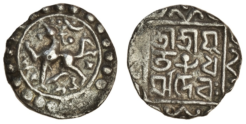 Tripura, Dharma Manikya (1714-? & 1728-29), Quarter-Tanka, 2.48g, Sk.1636, lion facing left, crescent and bead above and date below, within a circle and border of pellets, rev. Śrī Śrī Yu/ta [lingam] Dha/rma Devah within square with ornamented border (RB. 239; KM. 196), about very fine, rare