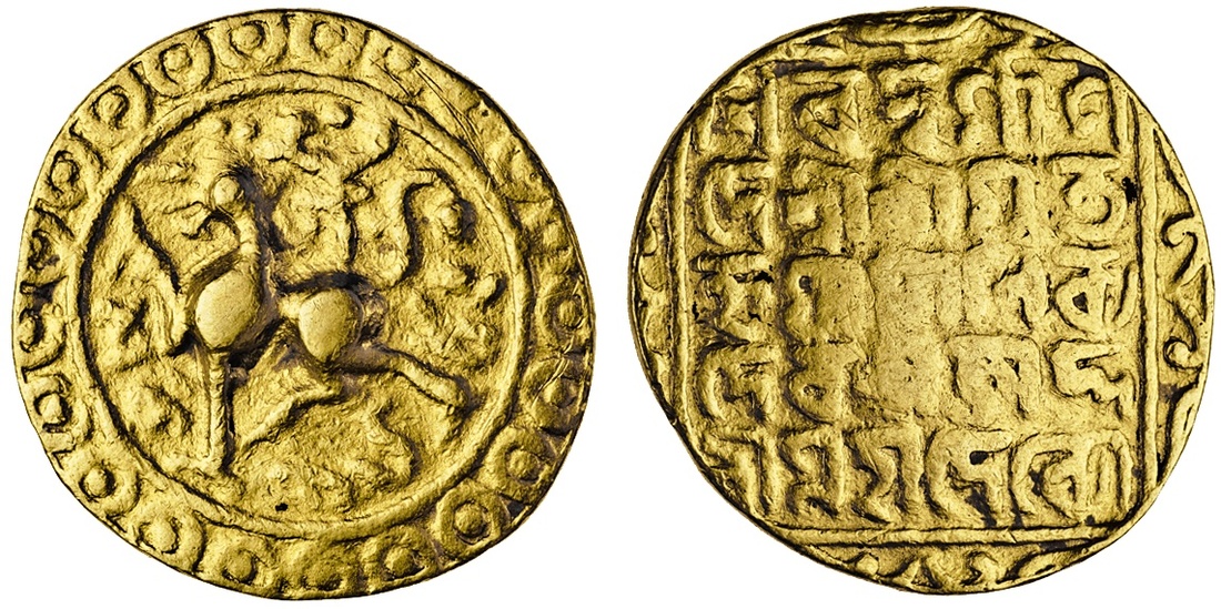 Tripura, Krishna Manikya (1760-61 & 1767-83), AV Mohur, 10.62g, dated Sk.1582 in error for Sk.1682, citing Queen Jahnavi, lion facing left, standard above, date below and to the right, within circle and border of beaded annulets, rev. Śiva Durga Pa/de Śrī Śrī Yuta/ Krishna Mānikya/ Deva Śrī Jāhna/vī Mahā Devyau, in square with ornamented border, (RB. 250; KM. 234 (plate coin)), small marks on the edge suggest that this coin may once have been in a mount, weakly struck, very fine, extremely rare