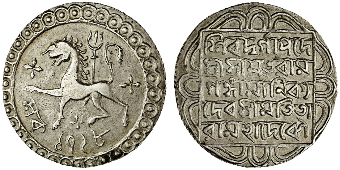 Tripura, Rama Ganga Manikya (first reign 1806-08), Tanka, 10.34g, Sk.1728, citing Queen Tara, lion facing left, trident above, crosses to left, right and below, date below, within circle with border of large-beaded annulets, rev. Śiva Durga Pade/ Śrī Śrī Yuta Rāma/ Ganga Mānikya/ Deva Śrīmati Tā/rā Mahā Devyau within square with looped arabesques in border, edge, diagonally milled (RB. 262; KM. 260 (plate coin)), very fine, some toning, very rare