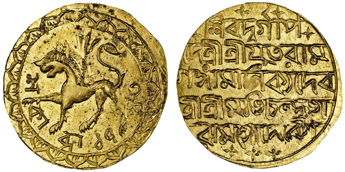 Tripura, Rama Ganga Manikya (second reign 1821-26), gold Mohur, 10.38g, Sk.1743, citing Queen Chandra Tara, lion facing left, trident on back, date below, within border of two circles with petals between, rev. Śiva Durga Pa/de Śrī Śrī Yuta Rāma/ Ganga Mānikya Deva/ Śrī Śrīmati Chandra Tā/rā Mahā Devyau, lozenge-shaped pellets arranged as crosses at top and bottom, all with circle (RB. 265; KM. 295 (plate coin)), about extremely fine but obverse weakly struck, of the utmost rarity