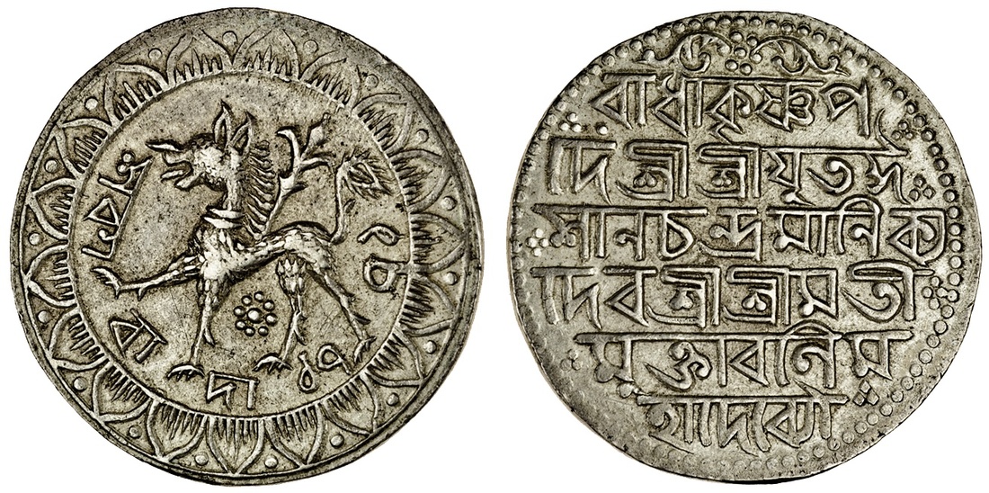 Tripura, Ishana Chandra Manikya (1849-69), Tanka, 10.47g, Sk.1771, citing Queen Muktavali, lion facing left, trident on back, date on three sides around lion, all within circular border of petals with five vertical lines in each, rev. Rādhā Krishna Pa/de Śrī Śrī Yutā I/ shāna Chandra Mānikya/ Deva Śrī Śrīmati/ Muktāvali Ma/hā Devyau, arabesque at top, all within circle of beads (RB. 280; KM. 336 (plate coin)), good very fine, extremely rare
