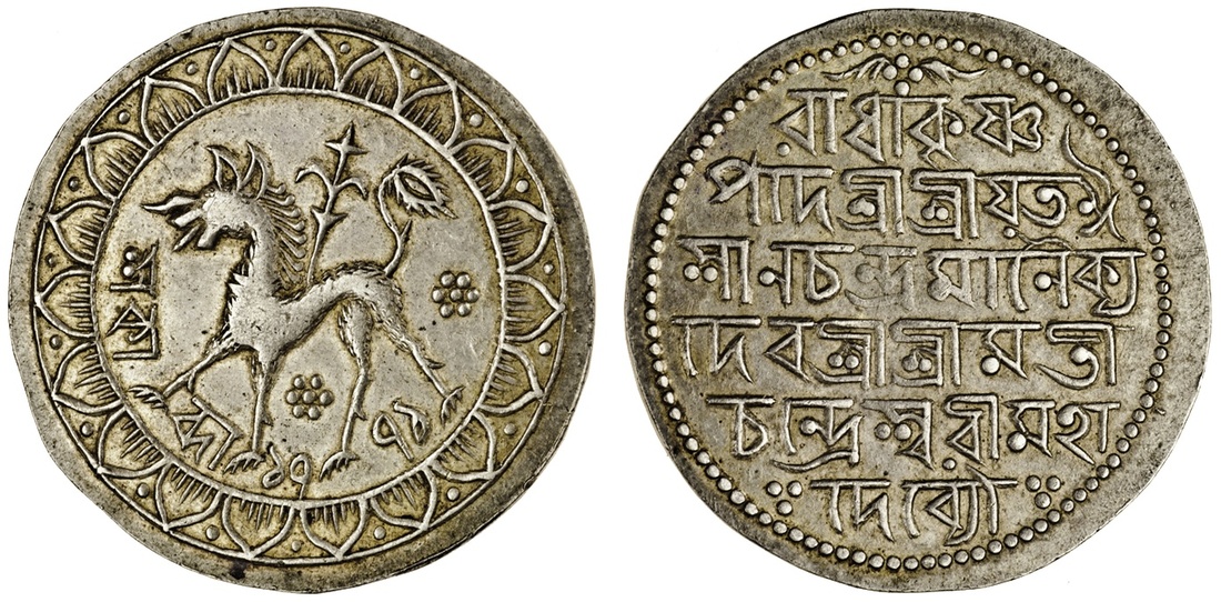 Tripura, Ishana Chandra Manikya (1849-69), Tanka, 10.36g, Sk.1771, citing Queen Chandresvari, lion facing left, trident on back, date on three sides around lion, all within circular border of petals with five vertical lines in each, rev. Rādhā Krishna /Pade Śrī Śrī Yutā I/ shāna Chandra Mānikya/ Deva Śrī Śrīmati/ Chandresvarī Mahā/ Devyau, arabesque at top, all within circle of beads (RB. 282; KM. 335 (plate coin)), about extremely fine, exceptional specimen, extremely rare