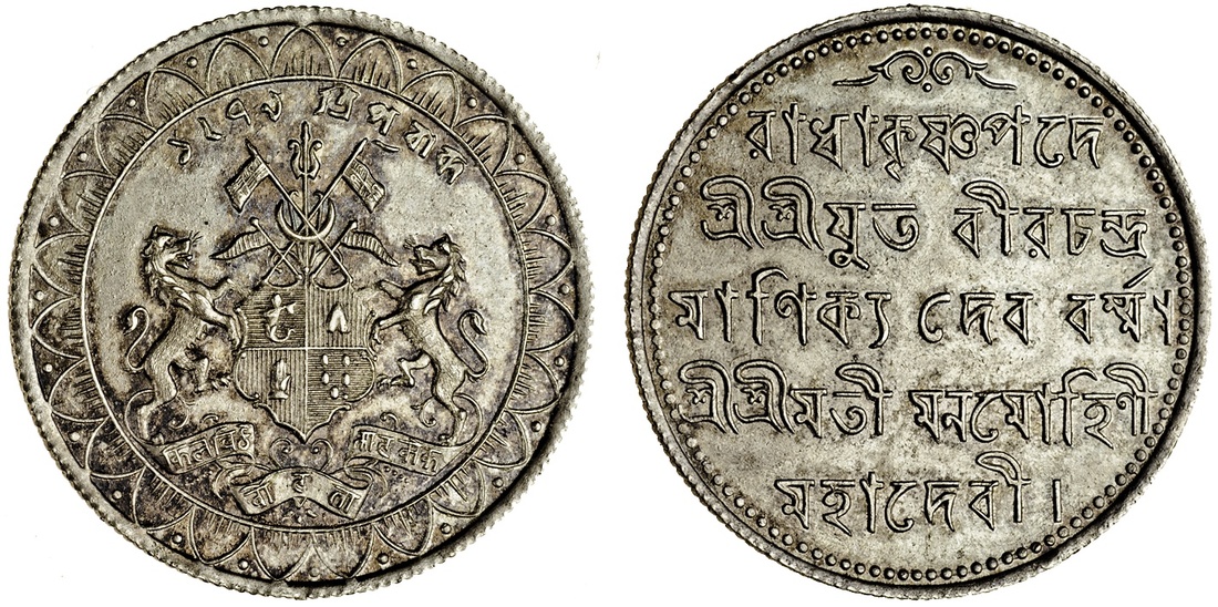 Tripura, Vira Chandra Manikya (1862-1896), machine-struck Tanka, 10.02g, TE.1279, citing Queen Manomohini, coat of arms of Tripura, date above, within ornate border, rev. Rādhā Krishna Pade/ Śrī Śrī Yutā Vīra Chandra/ Mānikya Deva Varmma/ Śrī Śrīmati Manomohinī/ Mahā Devi within beaded border (RB. 292; KM. 358), extremely fine and extremely rare
