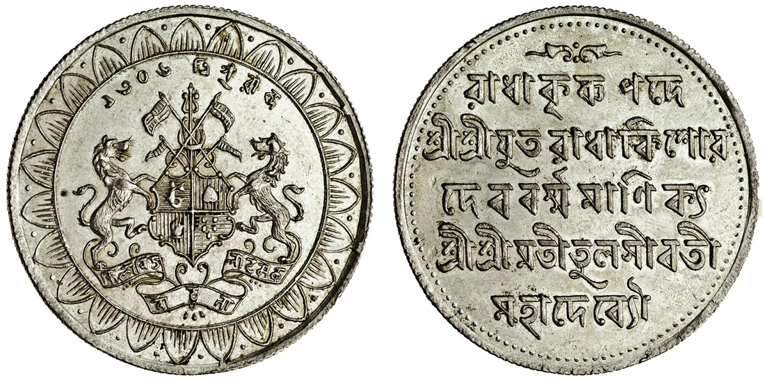 Tripura, Radha Kishora Deb Barman Manikya (1897-1909), machine-struck lightweight Tanka, 8.77g, TE.1306, citing Queen Tulasavati, coat of arms of Tripura, date above, within ornate border; rev. Rādhā Krishna Pade/ Śrī Śrī Yutā Rādhā Kishora/ Deb Barmma Mānikya/ Śrī Śrīmati Tulasīvatī/ Mahā Devyau within beaded border (RB. 298; KM. 376), extremely fine and extremely rare