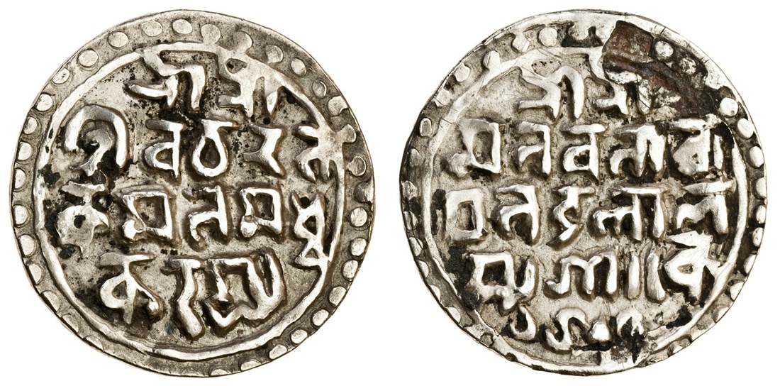 Cooch Behar, Nara Narayan (1487-1555), Tanka, 8.55g, Sk.1477, legend: Śrī Śrī/ Śiva Charana/ Kamala Madhu/ Karasya, with śi, ra, na in 2nd line in Nagari script, rev. Śrī Śrī/man Nara Nā/rāyana Bhupāla/sya Śāke/ 1477, both sides within circle and beaded border (RB. 3; Bose A-2.2; KM. 34), some dark adhesions, very fine