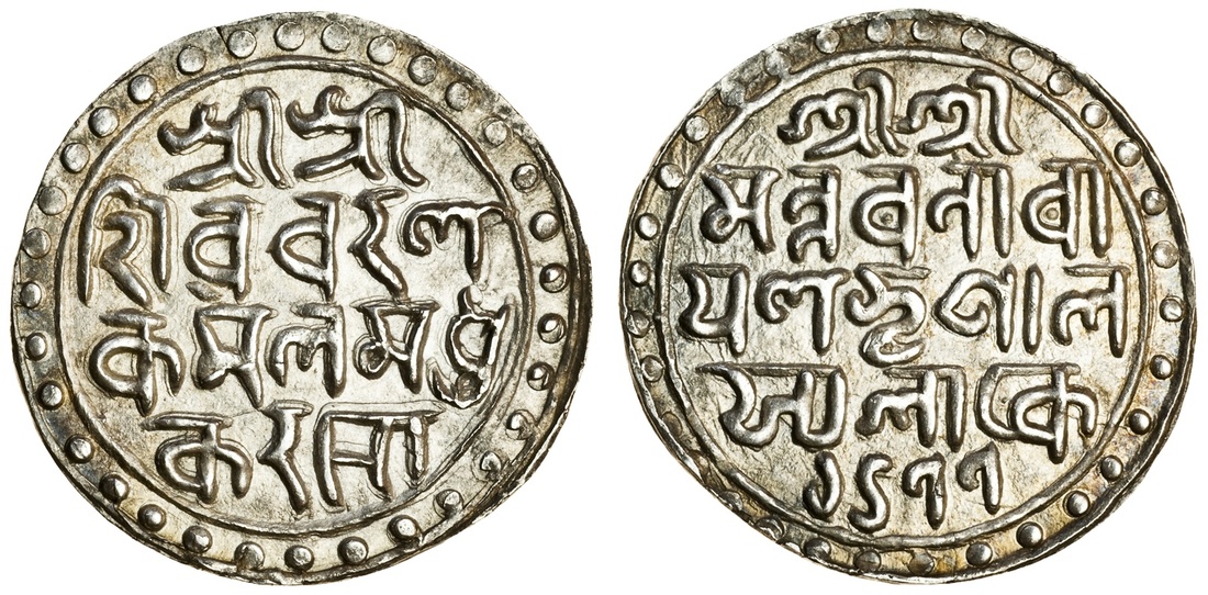 Cooch Behar, Nara Narayan (1487-1555), broad-flan Tanka, 33mm, 10.27g, Sk.1477, legend: Śrī Śrī/ Śiva Charana/ Kamala Madhu/ Karasya, with śi, ra in 2nd line and ra sya in 4th line in Nagari script, rev. Śrī Śrī/man Nara Nā/rāyana Bhupāla/sya Śāke/ 1477, both sides within circle and beaded border (RB. 3 var; Bose A-2.15; KM. 34), well struck on a large flan, extremely fine