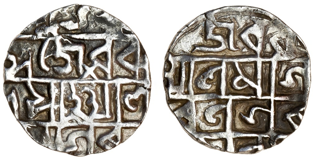 Mughal forces under Mir Jumla invaded Cooch Behar in 1661 and stayed there until 1663. During this period Prana Narayan fled to Bhutan. Mir Jumla made the city of Cooch Behar his base and changed its name to ‘Alamgirnagar. He also issued coins in the name of the Mughal emperor on the local standard and in the local script but using the Persian language. This coin does not have a clear regnal year pertaining to Aurangzeb, but the date of the invasion would suggest it is ‘4.’ The Mughal invasion ended up as a disaster, with much loss of life. This issue, which fits into both the Cooch Behar and Mughal series, is extremely rare.