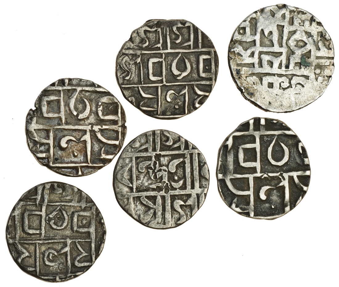 Cooch Behar, Prana Narayan (1633-65), Half-Tanka, 4.95g, Rupa Narayan (1695-1715), Half-Rupee, 4.28g, Upendra Narayan (1715-63), Half-Rupee, 4.73g, Devendra Narayan (1763-65), Half-Rupee, 4.54g, Rajendra Narayan (1771-73), Half-Rupee, 4.68g, Dharendra/ Harendra Narayan (1773-80/ 1783-1839), Half-Rupee, 4.47g, legends naming the respective ruler in each case (RB. 42, 62, 63, 64, 66, 68; Bose D-5, G-1, H-1, I-1, K-1, M-1; KM. 72, 109, 115, 121, 133, 141), generally very fine (6)