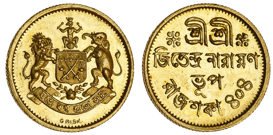 Cooch Behar, Jitendra Narayan (1913-22), machine-struck presentation gold Mohur, 7.83g, dated CB 404 (1914), arms of the state supported by lion and elephant, grish at bottom, rev. Śrī Śrī/ Jitendra Nārāyana/ Bhup/ Rāja Śakā 404 (RB.78; Bose R-1.1; KM.X.M10), about uncirculated with minor contact marks in fields, extremely rare