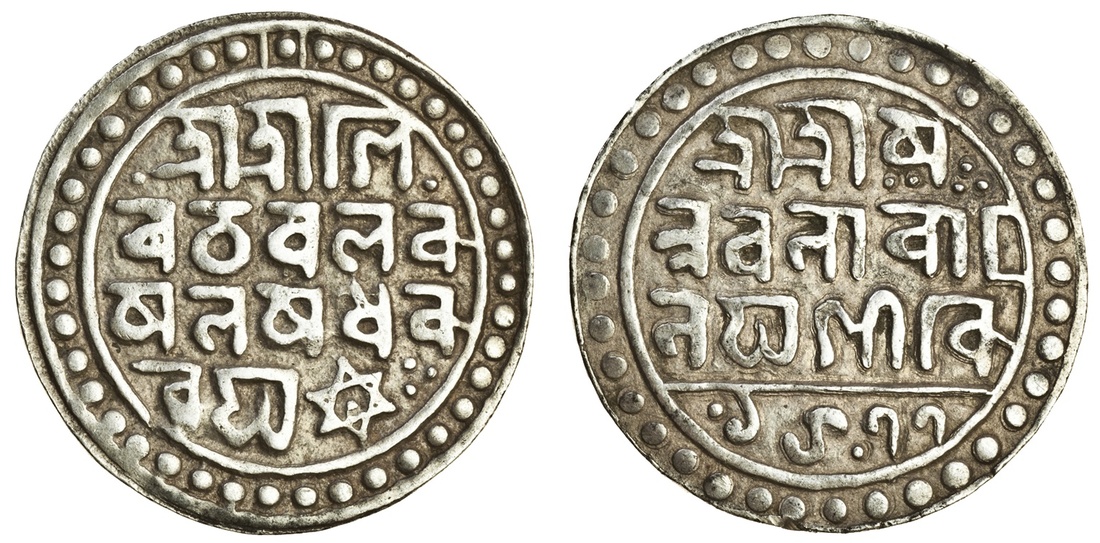 Kings of Khyriem, in the name of Nara Narayan of Cooch Behar, Tanka, 30mm, 9.68g, dated Sk.1477, legend in four lines on both sides, Śrī Śrī Śi/va Charana Ka/mala Madhu Ka/rasya [six-pointed star], rev. Śrī Śrīma/n Nara Nārāya/nasya Śāke/ 1477, line above date, within circle and border of beads (RB. Z5 (Jaintiapur); Bose A-9.2), very fine, very rare