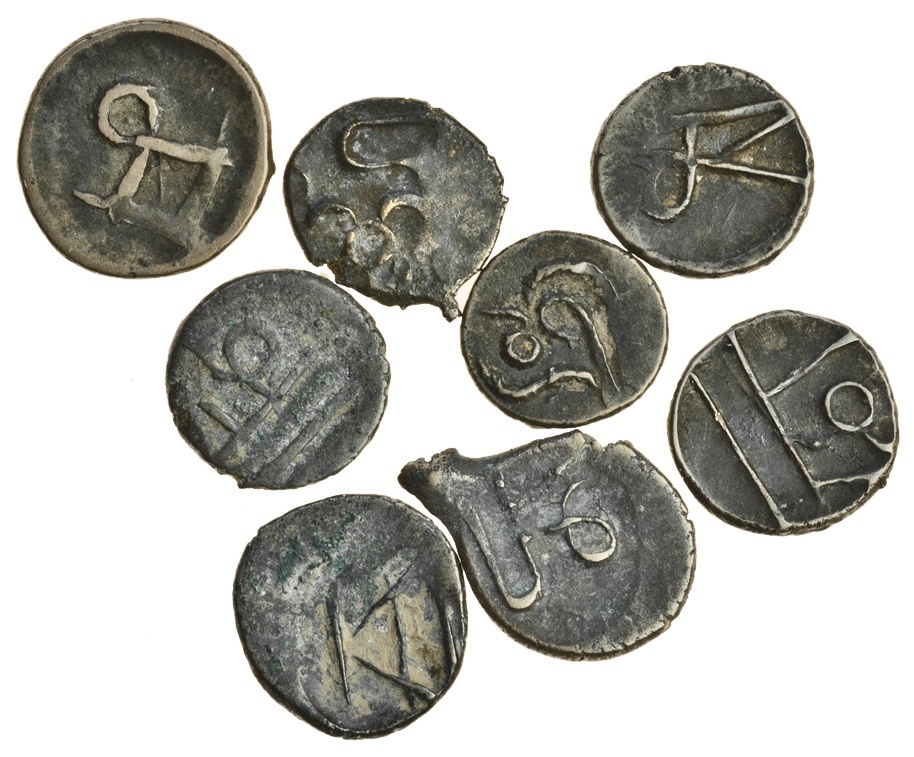 Manipur, group of 8 base-metal uniface Sels, as previous lot, with legends mā, bha?, rā, śri (2), others (3) (RB. pp50-51), crude fine to very fine (8)