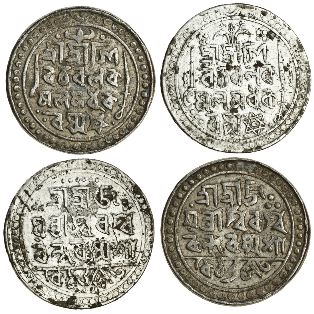 Jaintiapur, Bargosain II (1731-70), Tankas (2), 9.00, 9.98g, Sk. 1653, legends and main symbols as previous lot, but first with symbol ‘D’ above top line, the second with symbol ‘O’, different bead arrangements (RB. K4, 15; KM. 177), the second with some adhesions and damage, both very fine (2)