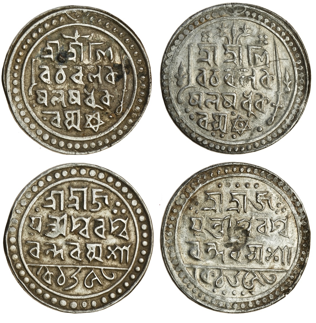 Jaintiapur, Bargosain II (1731-70), Tankas (2), 9.80, 9.55g, Sk. 1653, legends and main symbols as previous lot, but first with symbol ‘C’ above top line, the second with symbol ‘M’, different bead arrangements, the first with obverse punch, the second with reverse countermark (RB. K3, K13; KM. 177), very fine (2)