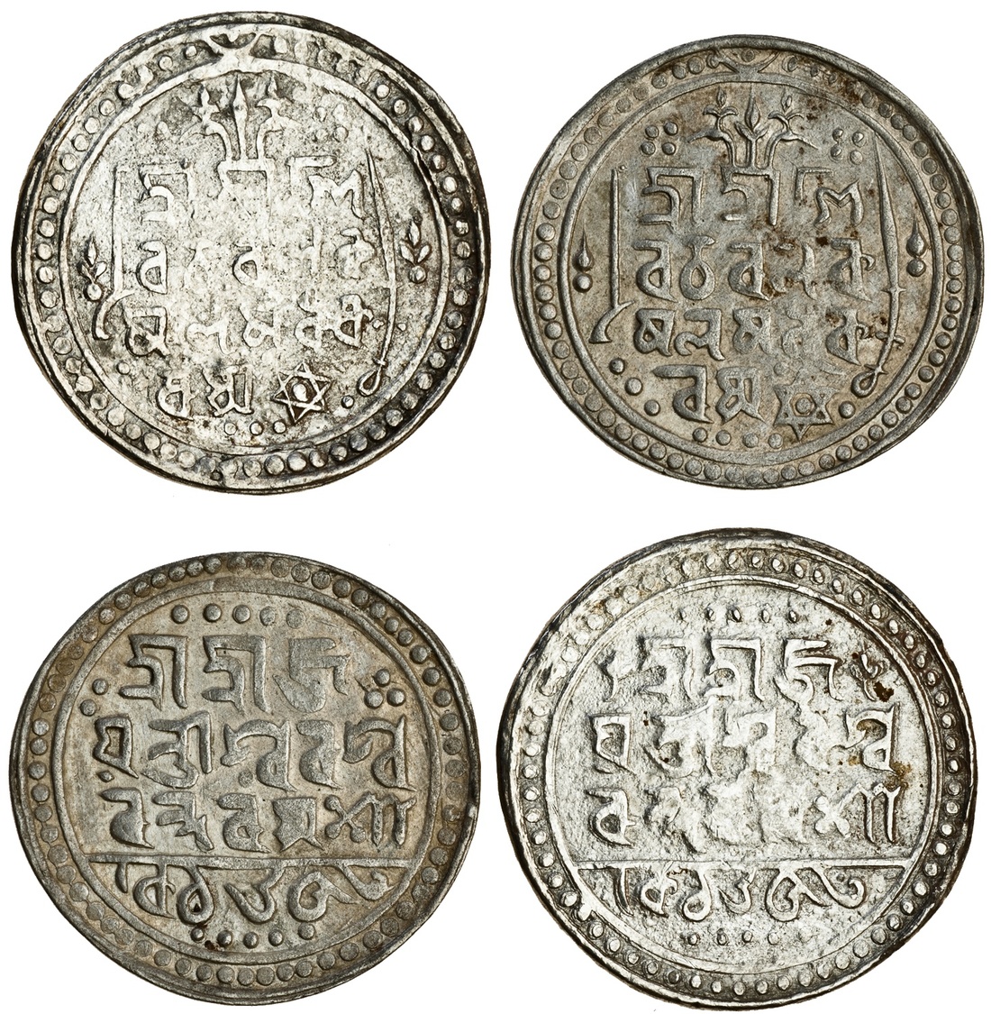 Jaintiapur, Bargosain II (1731-70), Tankas (2), 7.30, 9.35g, Sk. 1653, legends and main symbols as previous lot, but both with symbol ‘M’ above top line, different bead arrangements (RB. K13; KM. 177), the first weakly struck, fine, the second very fine (2)