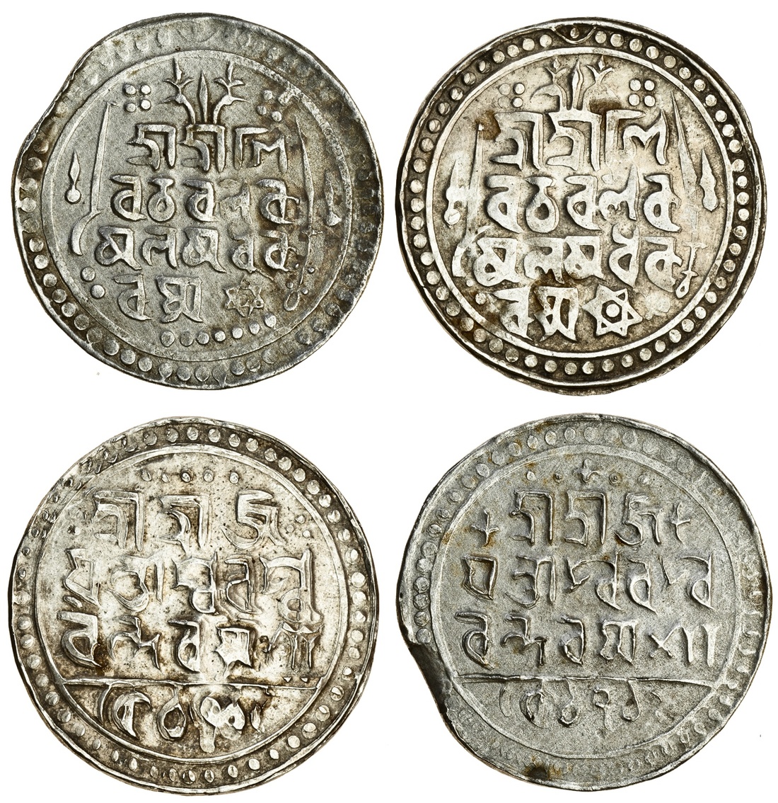 Jaintiapur, Ram Simha (1790-32), Tankas (2), 9.25, 8.78g, Sk 1712, as previous lot but with symbol M above top line, the first with four beads in lower field, the second with nine, rev. the first with five beads above legend and two beads to left and three to right of top line, the second with cross between two beads, and bud to left and right of top line (RB. O1a, O3b; KM. 206), the first poorly struck, good fine, the second with edge blow, very fine (2)