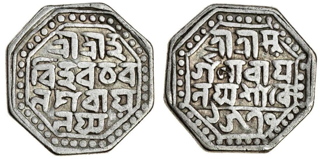 Assam, Jayadhvaja Simha (1648-63), octagonal Rupee, 11.34g, Sk. 1570, four line inscription in Assamese script on both sides within a double linear border with beads, Śrī Śrī Ha/ri Hara Chara/na Parāya/nasya, one bead lower right, rev. Śrī Śrī Śva/rga Nārāya/nasya Śāke / 1570 (RB. A3.4; KM. 1), one minor reverse test punch, very fine, scarce
