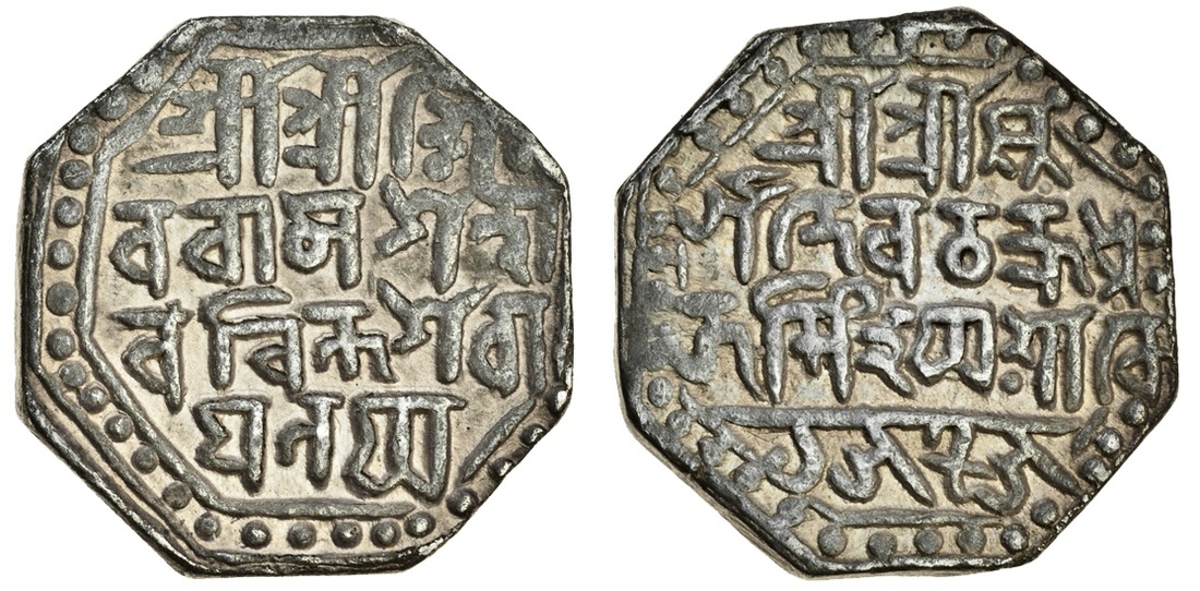 Assam, Chakradhvaja Simha (siu-pung-mung) (1663-70), octagonal Rupee, 11.14g, Sk. 1585, legends in Assamese script both sides within beaded border, Śrī Śrī Śi/va Rāma Padā/rabinda Parā/yanasya, rev. Śrī Śrī Sva/rga Deva Chakradhva/ja Simhasya Śāke/1585 (RB. B1.1; KM. 8), very fine, scarce