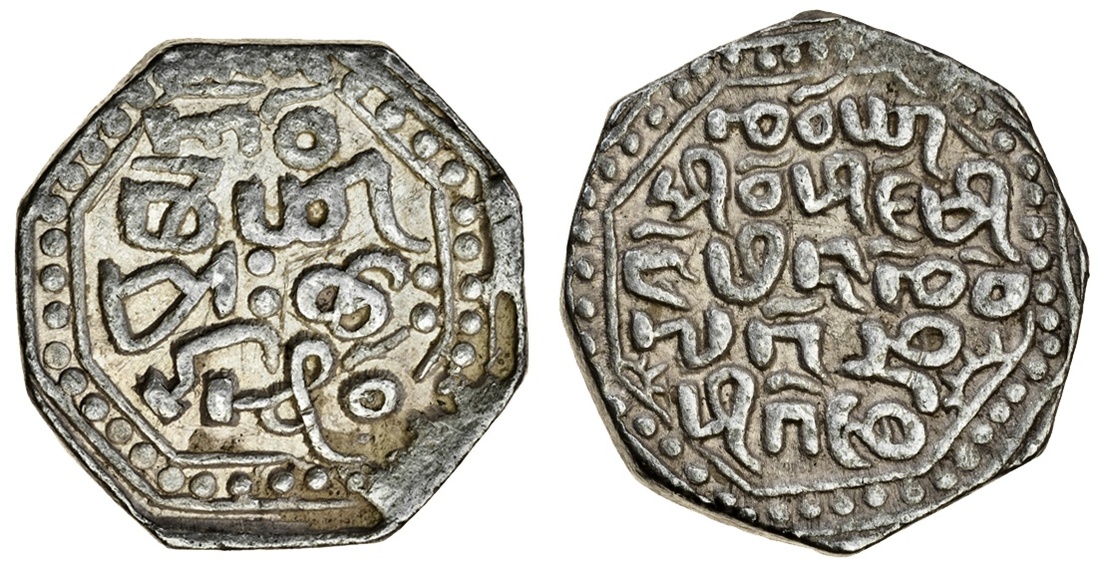 Assam, Chakradhvaja Simha (siu-pung-mung) (1663-70), octagonal Rupee, 11.23g, Ahom legends, dated the 15íth year (of the 60 year cycle) Kāo/ boi phā/ Tā-rā/ heu chiu, rev. Chao phā/ Siu-pung-mu/ng/ pin chan/ Lāk-ni/ plek-ngi (RB. 7; KM. 10), very fine, scarce