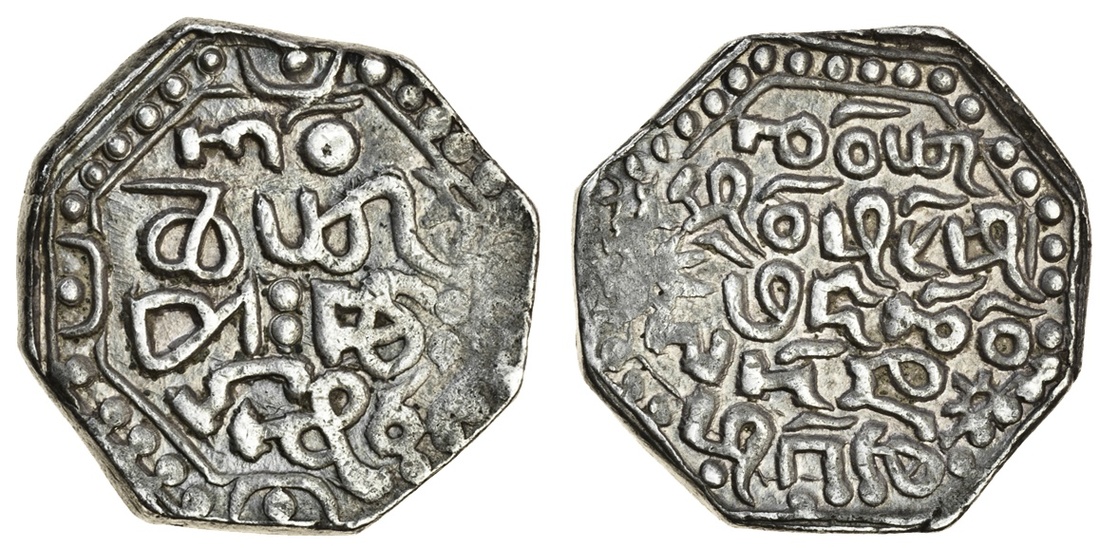 Assam, Chakradhvaja Simha (siu-pung-mung) (1663-70), octagonal Rupee, 11.39g, Ahom legends, dated the 15íth year (of the 60 year cycle) Kāo/ boi phā/ Tā-rā/ heu chiu, crescents in cardinal points of border, rev. Chao phā/ Siu-pung-mu/ng/ pin chan/ Lāk-ni/ plek-ngi, lion to left in border (RB. B9.1; KM. -), toned very fine, scarce