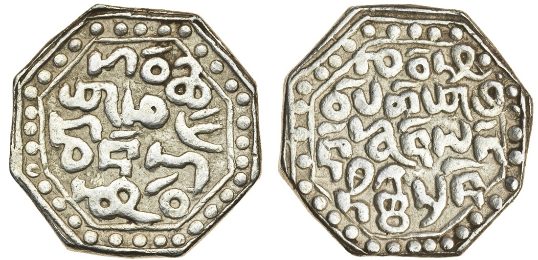 Assam, Gadadhara Simha (Siu-pat-pha) (1681-96), octagonal Rupee, 11.11g, Ahom legends, dated year 33 (of the 60 year cycle), legends in four lines on each side within the usual beaded border, Kāo boi/ phā Leng-/don heu/chiu, rev. Chao Siu-/pat-phā pi/n khun lāk/-ni Rāi-sān (RB. E1.2; KM. 28), very fine