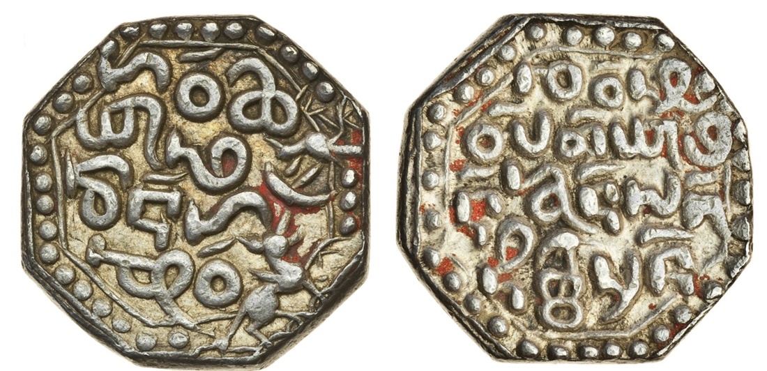 Assam, Gadadhara Simha (Siu-pat-pha) (1681-96), octagonal Rupee, 11.04g, as previous lot but obverse with a lion lower right chasing a bird, upper right (RB. E3; KM. 30), with old toning and traces of red powder, good very fine