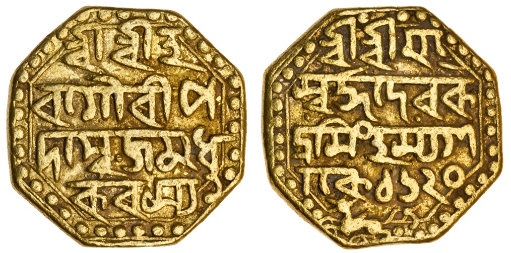Rudra Simha succeeded his father in AD 1696 and straightaway made significant changes to the coinage: the inscriptions were Sanskrit rather than Ahom, and engraved in Assamese script, and the coins (apart from the Half- Rupees) began to bear the actual date of striking, not a fixed date. The coins also bear a Saivite invocation. Gold coinage is extremely rare, being known from very few examples.