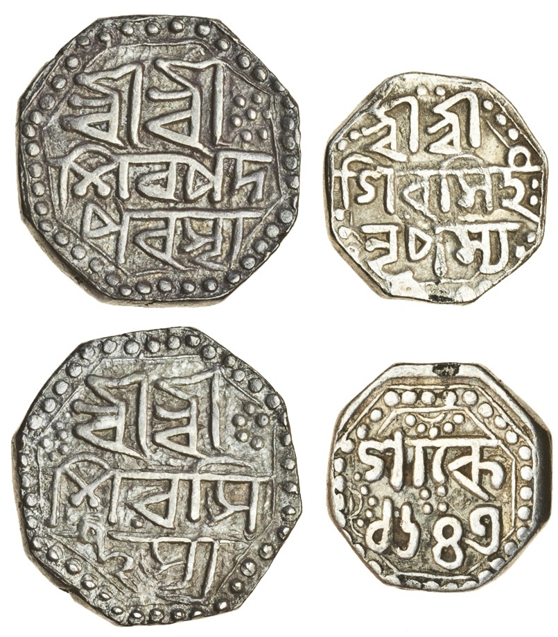 Assam, Śiva Simha (1714-44), octagonal Half-Rupee, 5.60g, no queen, undated, legends in three lines on each side: Śrī Śrī/ Śiva Pada/Parasya, rev. Śrī Śrī/ Śiva Si/mhasya; octagonal Quarter-Rupee, 2.78g, Sk. 1643, Śrī Śrī/ Śiva Simha/ Nrpasya, rev. Śāke/ 1643 (RB. G15.1, G17.1; KM. 49, 47), very fine and about very fine, the quarter rupees rare (2)