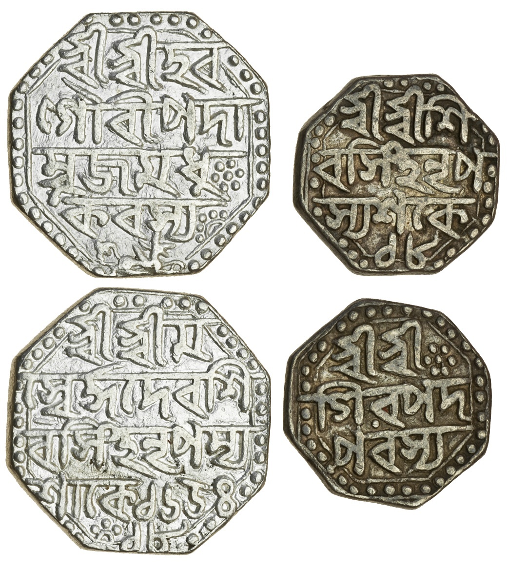 Assam, Śiva Simha (1714-44), octagonal Rupee, 11.32g, Assamese script, Sk. 1654, year 18, no queen cited, Śrī Śrī Hara/ Gaurī Padā/mbuja Madhu/karasya, lion running to right below, rev. Śrī Śrīma/t Svarga Deva Śi/va Simha Nrpasya/ Śāke 1654/18, Quarter-Rupee, 5.49g, year 18, similar to Rupee but legends Śrī Śrī/ Śiva Pada/ Parasya, rev. Śrī Śrī Śi/va Simha Nrpa/sya Śake/18 (RB. J1.1, 2.1; KM. 81, 83), good very fine and very fine (2)