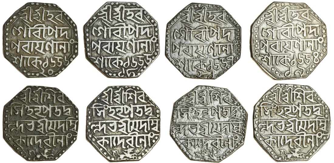Assam, Śiva Simha (1714-44), octagonal Rupees (4), Sk. 1654 year 19, 1655 year 19, 1656 year 20, 1657 year 21, citing Queen Ambika, legends as previous lot (RB. K6.2, 7.2, 9, K10; KM. 91), very fine to good very fine (4)