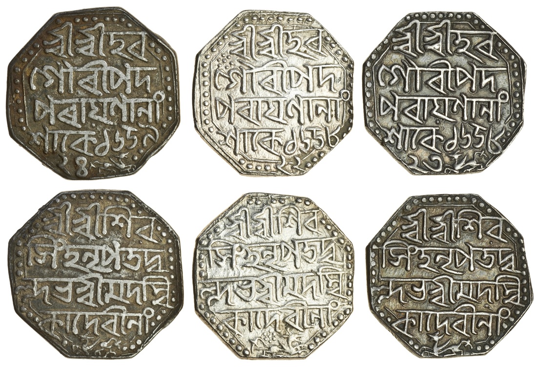 Assam, Śiva Simha (1714-44), octagonal Rupees (3), Sk. 1658 year 22, 1658 year 23, 1659 year 24, citing Queen Ambika, legends as previous lot, position of lion varies (RB. K11.2, 15.1, 16.1; KM. 91, 93, 94), very fine (3)