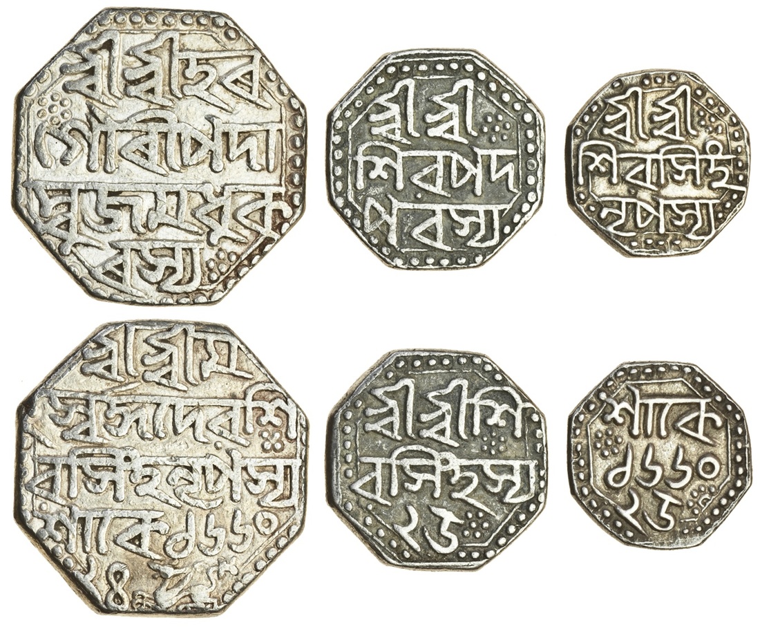 Assam, Śiva Simha (1714-44), octagonal Rupee, 11.22g, Sk.1660 year 24, without queen, Śrī Śrī Hara/ Gaurī Padā/mbuja Madhuka/rasya, rev. Śrī Śrīma/t Svarga Deva Śi/va Simha Nrpasya/ Śāke 1660/ 24; lion left next to regnal year, octagonal Half-Rupee, 5.63g, year 25, without queen,. Śrī Śrī/ Śiva Pada/ Parasya, rev. Śrī Śrī Śi/va Simhasya/ 25, Quarter-Rupee, 2.76g, Sk.1660 year 25, without queen, Śrī Śrī/ Śiva Simha/ Nrpasya, rev. Śāke/ 1660/ 25 (RB. L4.2, 9.1, 11.1; KM. 100, 102, 104), very fine to good very fine, the Half and Quarter-Rupee rare (3)
