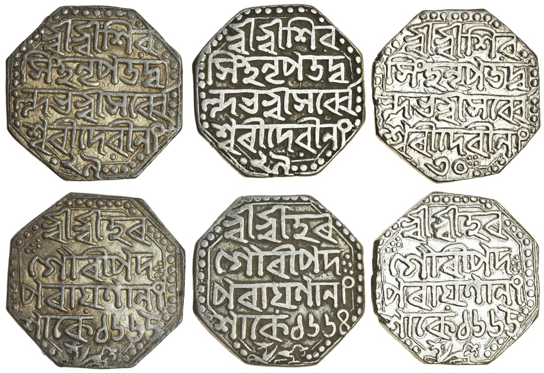 Assam, Śiva Simha (1714-44), octagonal Rupees (3), Sk. 1664 year 29, 1665 year 29, 1665 year 30, citing Queen Sarvveśvari, Śrī Śrī Hara/ Gaurī Pada/ Parāyanānam/ Śāke/ [year], lion running to left, below, rev. Śrī Śrī Śiva/ Simha Nrpa Tadva/llabha Śrī Sarvve/śvarī Devīnām/ [regnal year] (RB. M11.1, 12.1, 13.1 ; KM. 112), very fine (3)