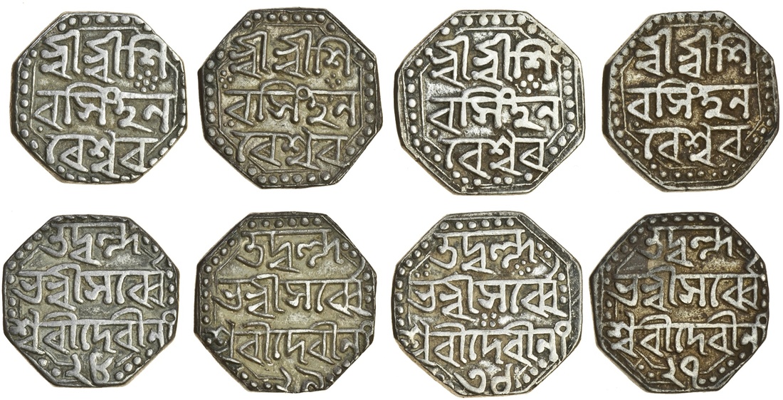 Assam, Śiva Simha (1714-44), octagonal Half-Rupees (4), years 27, 28, 29, 31, citing Queen Sarvveśvari, Śrī Śrī Śi/va Simha Na/reśvara, rev. Tadvalla/bha Śrī Sarvve/śvarī Devīnām/ regnal year (RB. M19.1, 20.1, 21.4, M23.2; KM. 110), very fine (4)