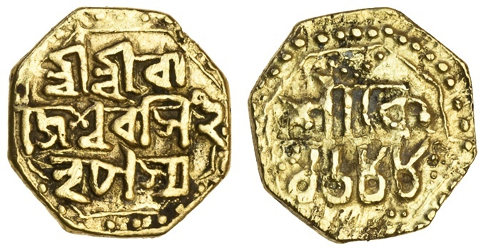 Assam, Rajeśvara Simha (1751-69), octagonal gold Quarter-Mohur, 2.81g, Sk. 1688, Śrī Śrī Rā/jeśvara Simha/ Nrpasya, rev. Śāke 1688 (RB. O30.1; KM. 139), reverse poorly executed, good fine, rare