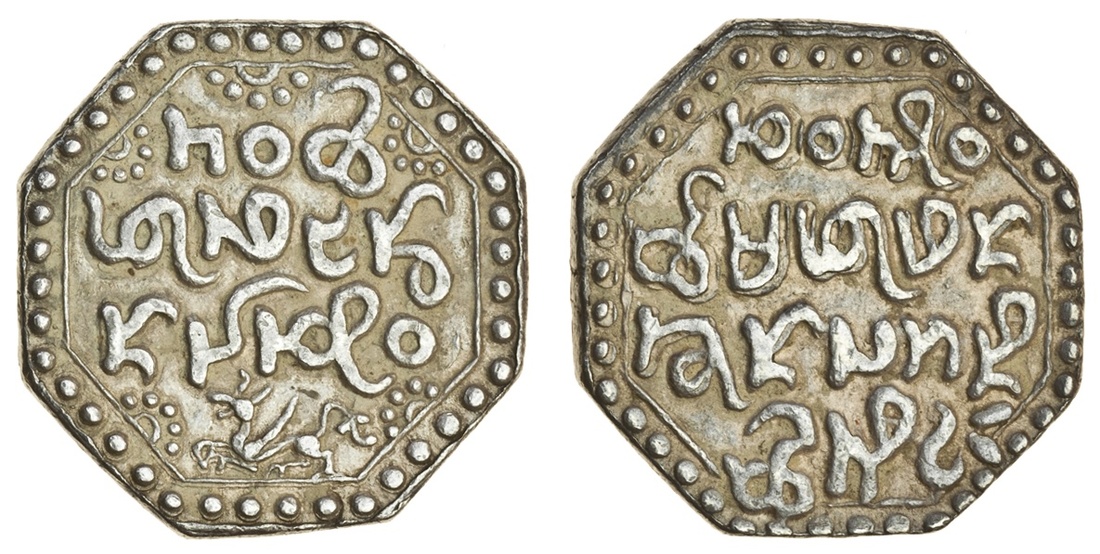 Assam, Rajeśvara Simha (Siu-rem-pha) (1751-69), octagonal Rupee, 11.32g, Sk. 1674, Ahom legends, Kao boi/ Phā Leng-don/ heu chiu, lion running left below, rev. Chao Siu-/rem-phā pin-/khun lāk-ni/ Rāi-si-ngā, (RB. O2.1; KM. 167), very fine, extremely rare