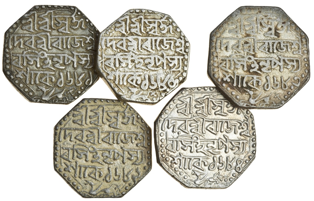 Assam, Rajeśvara Simha (1751-69), octagonal Rupees (5), Assamese script, Sk. 1680, 1681, 1682, 1683, 1684, legends as previous lot (RB. O42.3, 43.1, 44.1, 45.2, O46.2; KM. 134), generally very fine (5)